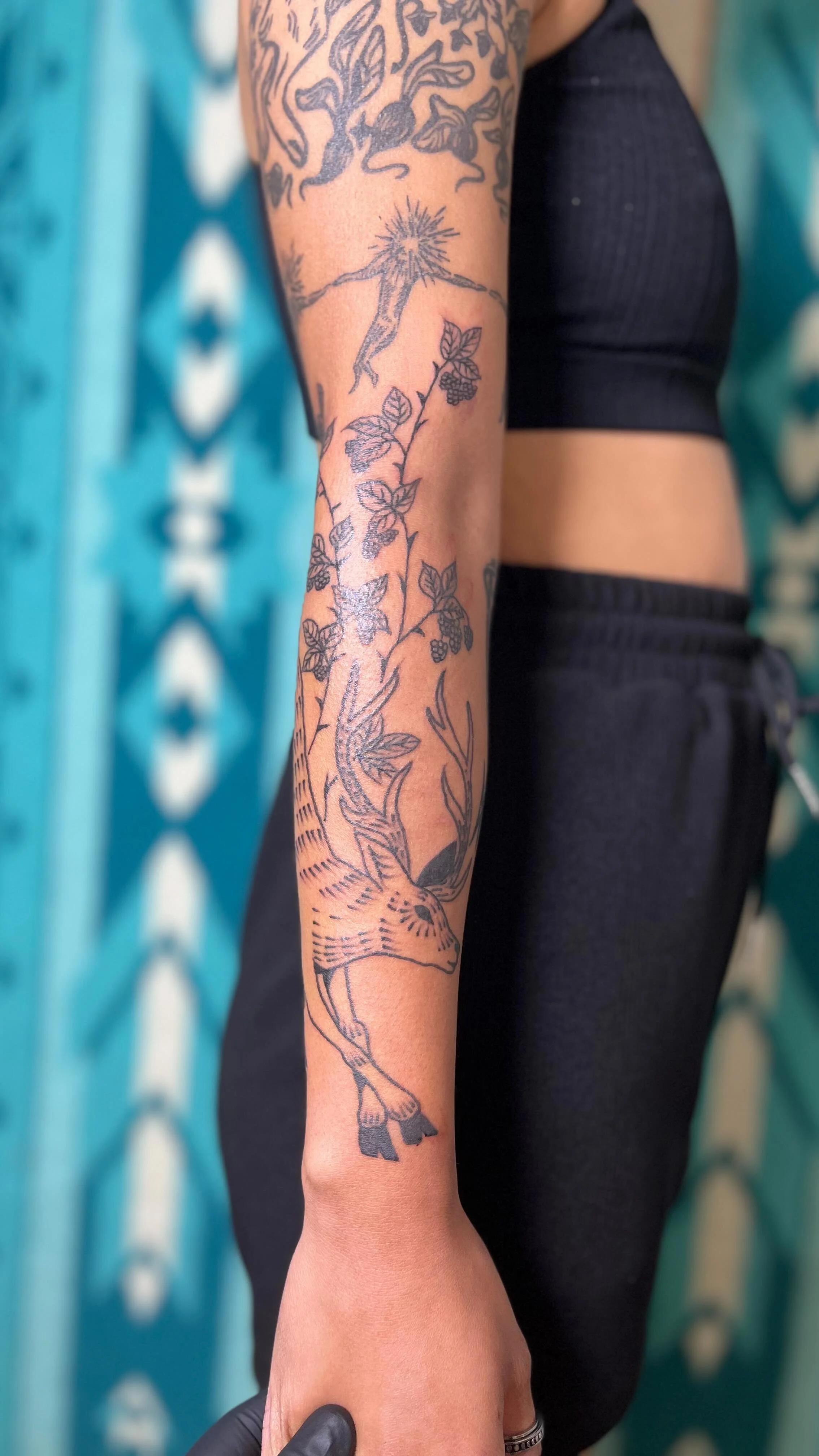 is a Michif, Anishinaabe & white mixed tattooer. They are a descendant of the Turtle Mountain Band of Chippewa and a citizen of the Manitoba MΓ©tis Federation. They like bold colors and bold linework, woodcuts, Ojibwe and Michif floral designs, horror, anime, and ledger art. Their tattooing practice is focused on connection and reclamation of culture and identity, especially for the Native community. When not tattooing Ned fundraises for mutual aid, road trips to the plains, makes comics, illustrations, and concept art, plays FFXIV and cosplays. Their cat Jiji is a celebrity.